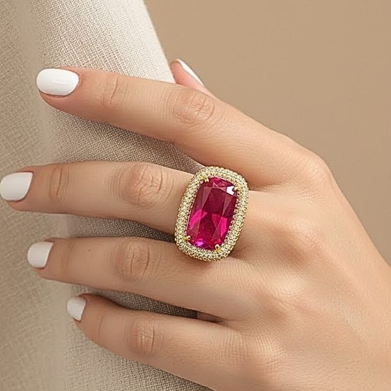 Este anel banhado a ouro 18k combina a força de uma pedra rosa vibrante com o brilho inconfundível de mais de 300 zircônias cuidadosamente cravejadas ✨. Um verdadeiro espetáculo de luz e elegância que transforma qualquer look em uma produção de destaque.