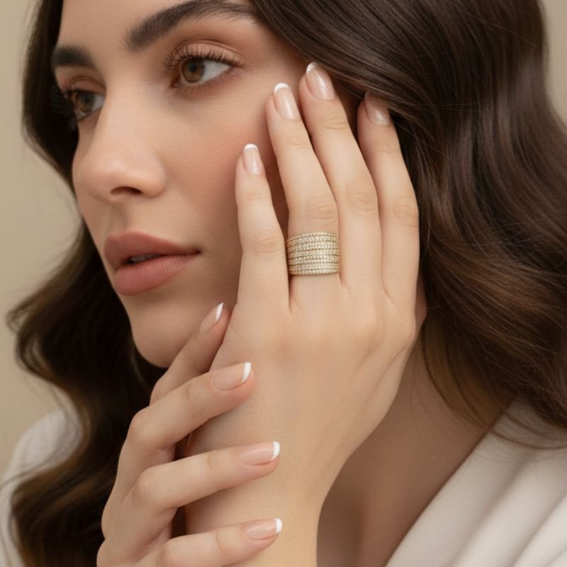 Este anel é banhado a ouro 18k e inteiramente cravejado com zircônias brilhantes, criando um efeito luxuoso e marcante. Ideal para quem ama acessórios que elevam qualquer produção com muito brilho e elegância.