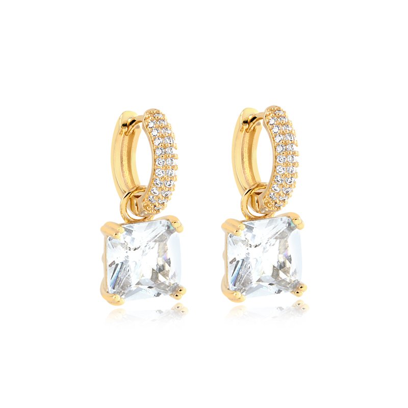 BRINCO ARGOLA CRAVEJADA COM PINGENTE QUADRADO – LUXO, BRILHO E DESIGN EXCLUSIVO ✨🔲