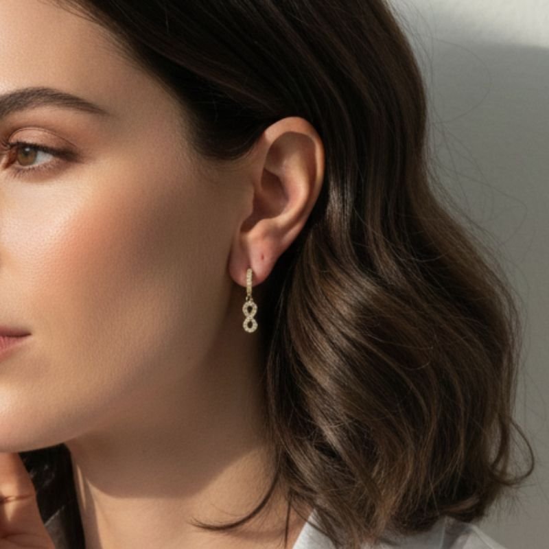 A Argola Infinito com Zircônias banhada a ouro 18k traz o símbolo do infinito em um design delicado e cheio de significado, realçado pelo brilho sutil das zircônias. Essa peça une estilo e simbolismo, perfeita para mulheres que valorizam joias que contam histórias.