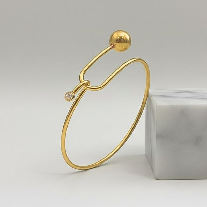 O Bracelete Esfera e Pedra é uma peça elegante que combina a suavidade da esfera com o brilho marcante da pedra central. Seu design contemporâneo traz harmonia e sofisticação ao visual, sendo a escolha perfeita para quem busca um acessório moderno e cheio de personalidade.