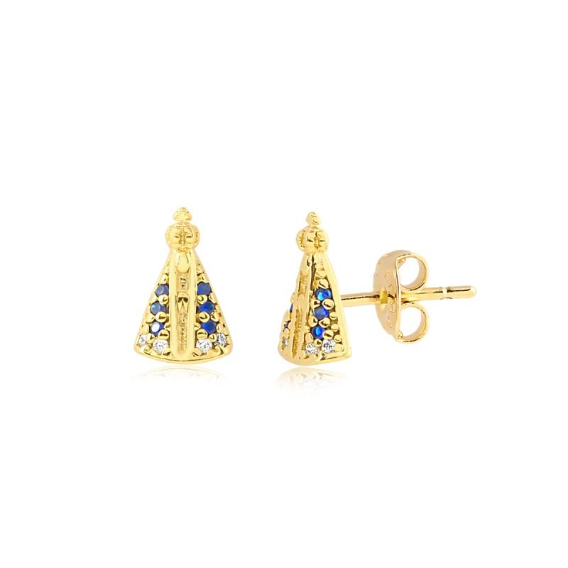 BRINCO SANTA COM ZIRCÔNIA AZUL BANHADO A OURO 18K – FÉ E BELEZA EM UMA PEÇA SINGULAR ✨💙