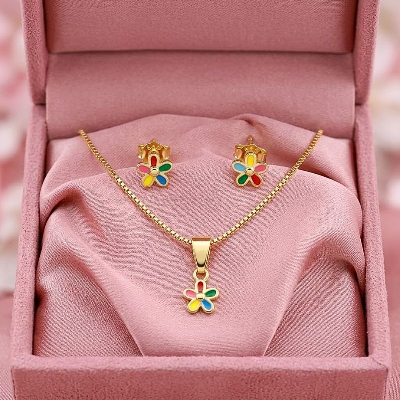 Cheio de charme e cor, o Conjunto Infantil com Resina Colorida é a escolha perfeita para iluminar os primeiros momentos com amor e estilo. Composto por pingente e brinco delicadamente esmaltados em resina colorida, o conjunto acompanha uma corrente veneziana de 35 cm + extensor, garantindo conforto e caimento ideal para o público infantil.