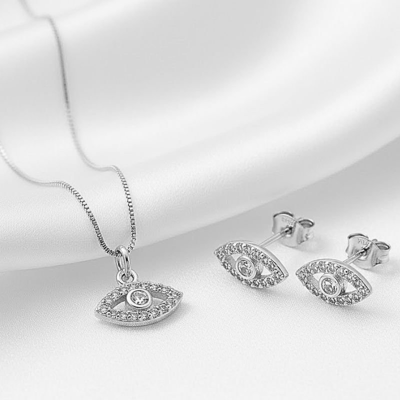 Este lindo conjunto em prata 925 traz o tradicional olho grego, símbolo de proteção contra energias negativas, em um design moderno e delicado. Ideal para quem deseja uma joia com significado e que pode ser usada todos os dias com conforto e segurança.