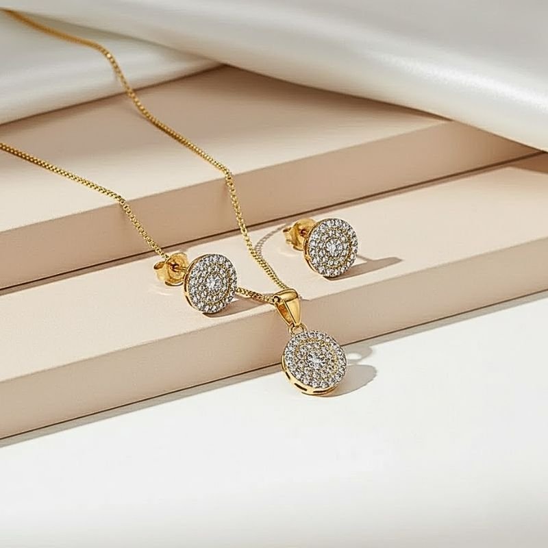 CONJUNTO REDONDO CRAVEJADO BANHADO A OURO 18K – BRILHO E SOFISTICAÇÃO ✨💛