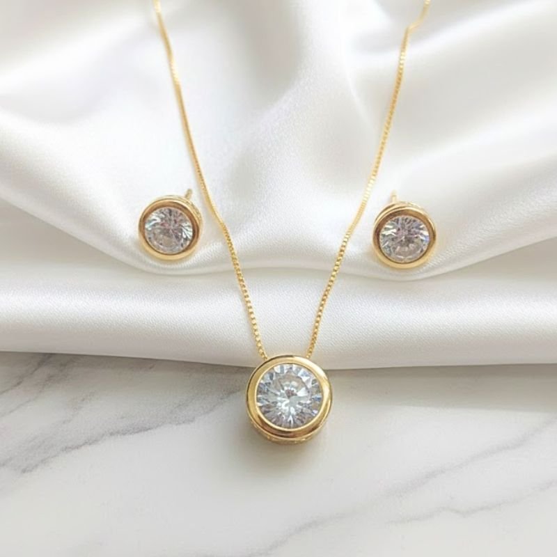 O Conjunto Redondo Banhado a Ouro 18K é uma joia clássica e sofisticada, perfeita para quem busca delicadeza e brilho em cada detalhe. O design redondo transmite suavidade e elegância, valorizando qualquer produção com um toque refinado.