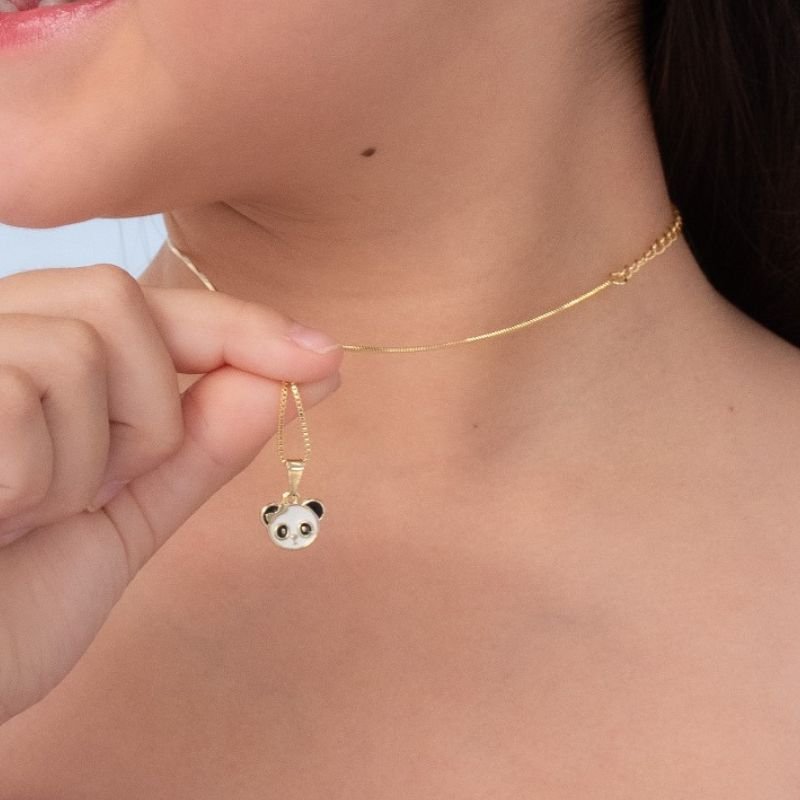 Da coleção Encanto do Dia das Crianças, esta gargantilha infantil banhada a ouro 18k traz um encantador pingente de panda com aplicação resinada, unindo delicadeza e diversão para o visual dos pequenos. A corrente veneziana de 35 cm com extensor de 5 cm oferece um ajuste confortável e seguro, perfeito para acompanhar as aventuras diárias com muito estilo e leveza.