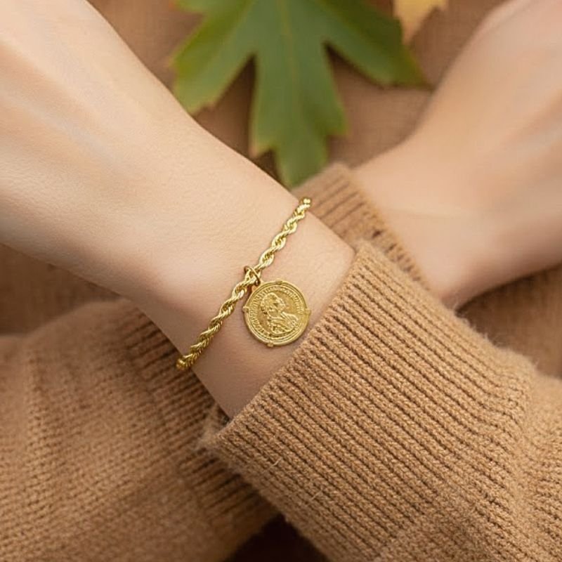 PULSEIRA CORDÃO BAIANO E MOEDA AUSTRÍACA BANHADA A OURO 18K – LUXO E SOFISTICAÇÃO ✨