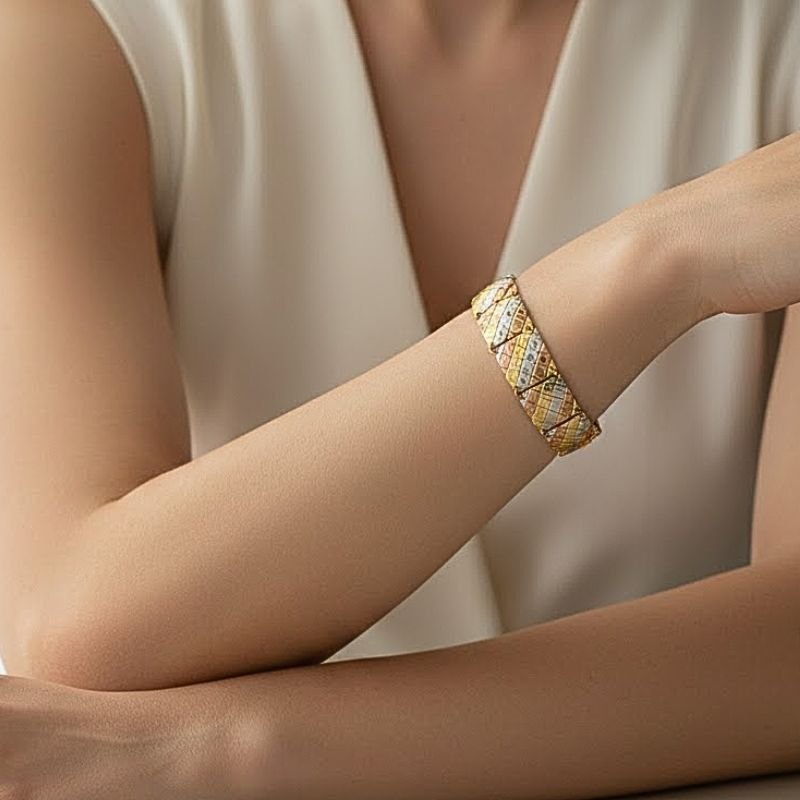 A pulseira tricolor banhada a ouro 18k com acabamento em ródio é uma joia sofisticada que une elegância, modernidade e versatilidade. Com design inspirado na réplica de ouro, ela apresenta acabamento refinado em três cores — dourado, rosé e prateado — permitindo combinações perfeitas com diferentes estilos e acessórios.