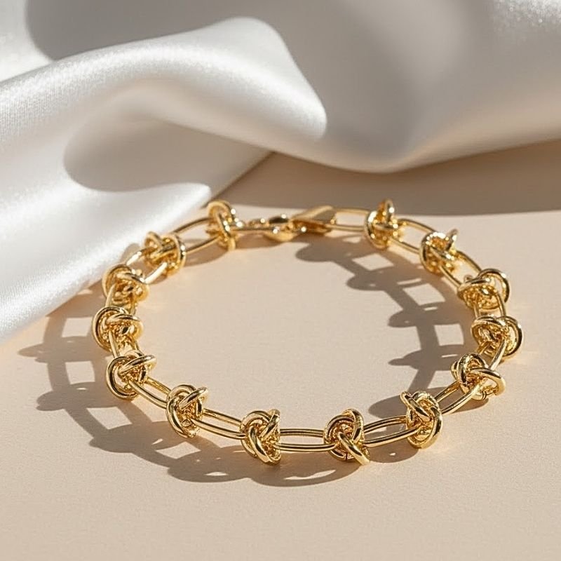 PULSEIRA ELOS LARGOS E NÓ EM OURO 18K – DESIGN AUTÊNTICO COM TOQUE DE ORIGINALIDADE ✨