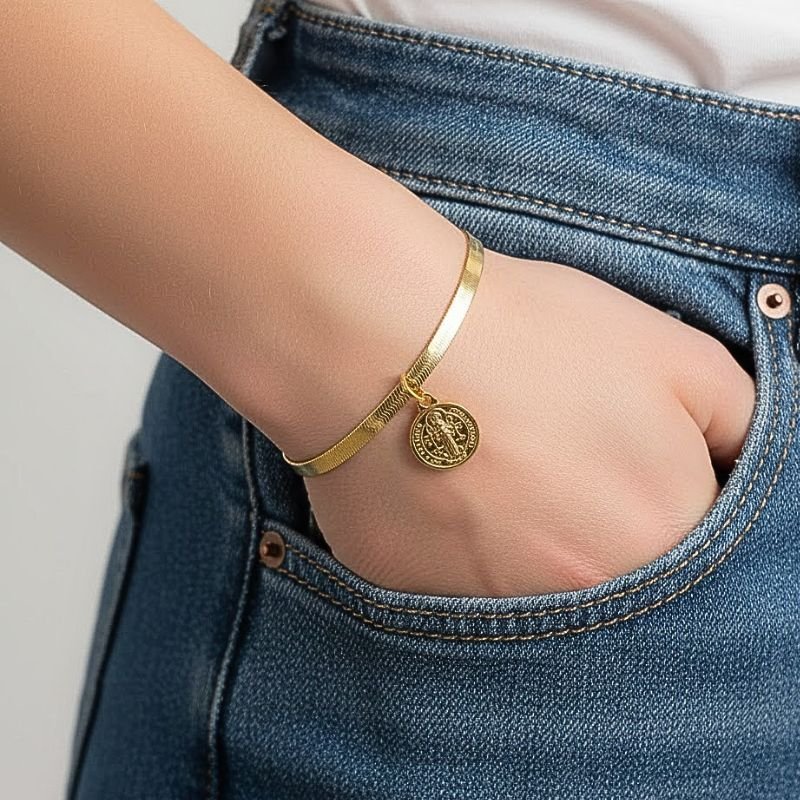 📌 Detalhes: Pulseira banhada a ouro com fita delicada e medalhão de São Bento, acabamento refinado e design elegante