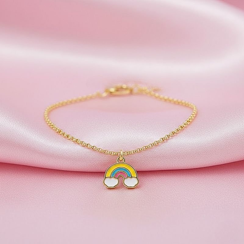 A Pulseira Infantil Arco-Íris Banhada a Ouro 18K é uma joia delicada, divertida e cheia de charme para crianças. Com detalhes coloridos em formato de arco-íris, transmite alegria e leveza, tornando qualquer look infantil mais encantador.