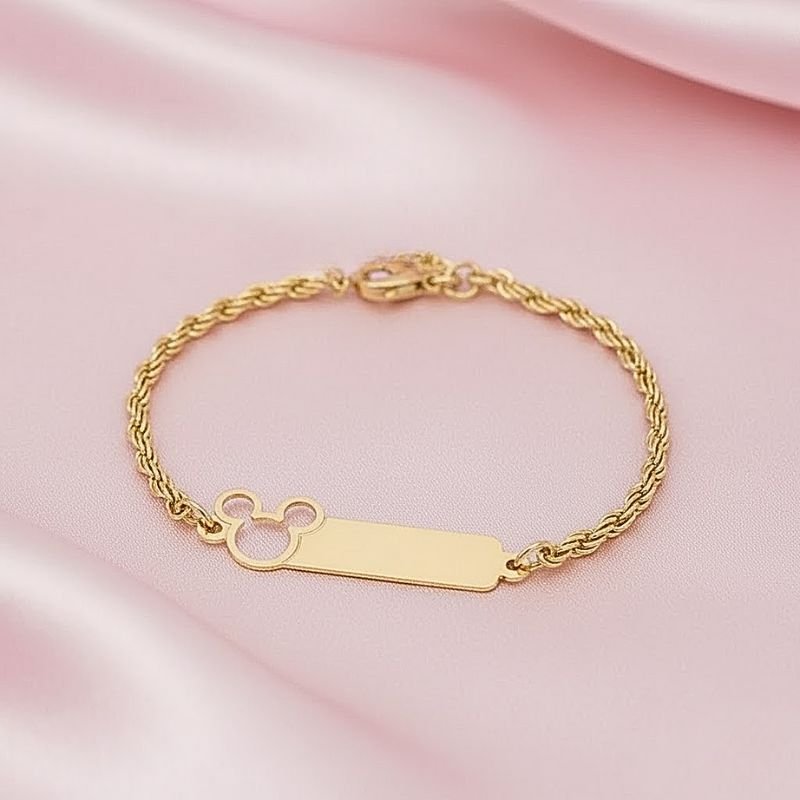 A Pulseira Infantil Placa Minnie Banhada a Ouro 18K é uma joia delicada e encantadora, ideal para crianças. Com um pequeno detalhe da personagem Minnie, ela transmite alegria, diversão e charme, tornando qualquer look infantil ainda mais especial.