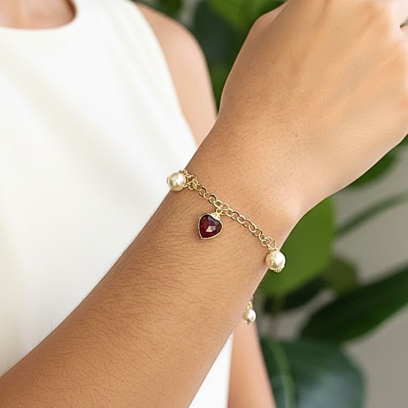 📌 Detalhes: Pulseira banhada a ouro com pérolas e pingente de coração vermelho, acabamento refinado e design elegante