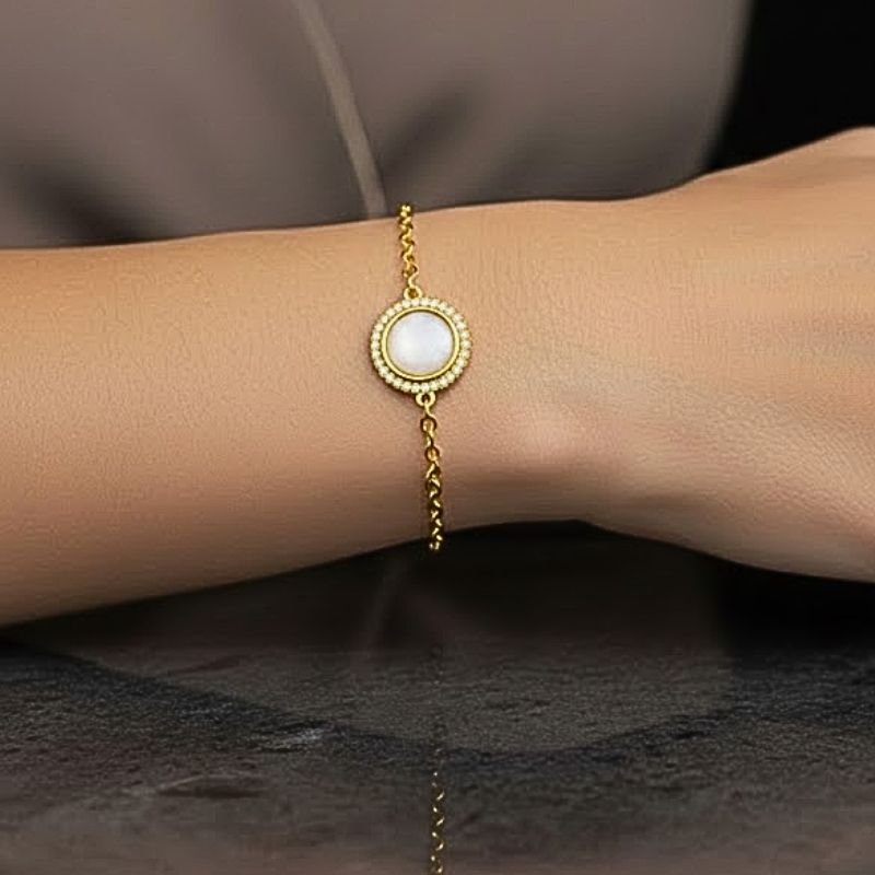 📌 Detalhes: Pulseira banhada a ouro com pedras e efeito perolado, acabamento refinado e design delicado