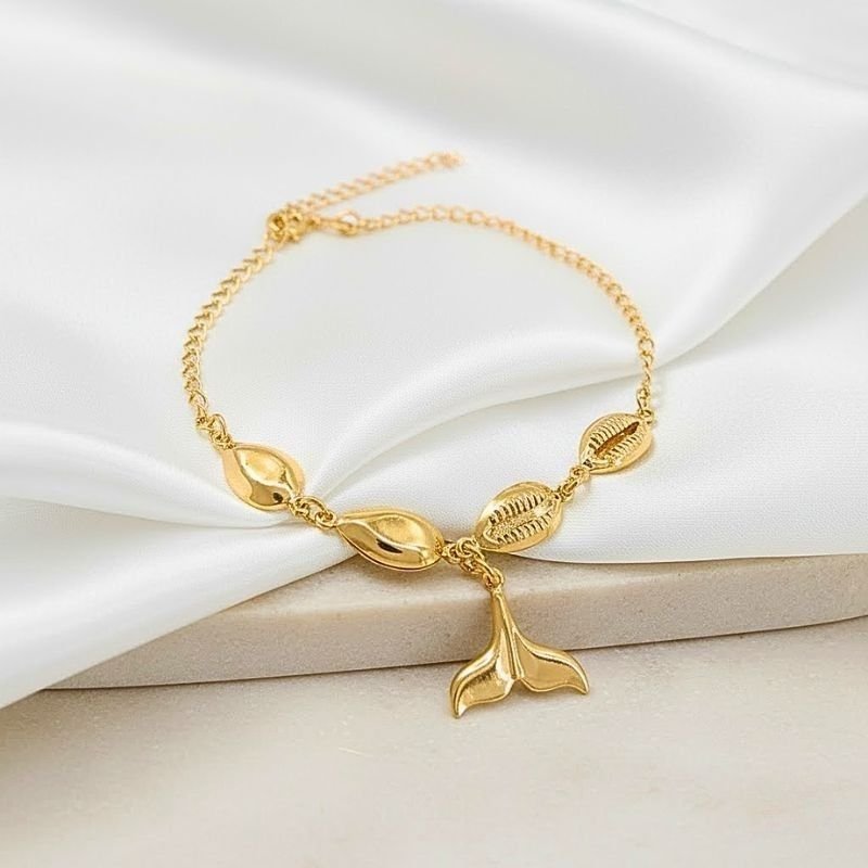 🌊 Tornozeleira Búzio e Rabo de Baleia Folheada a Ouro 18K – Espírito do mar em forma de joia