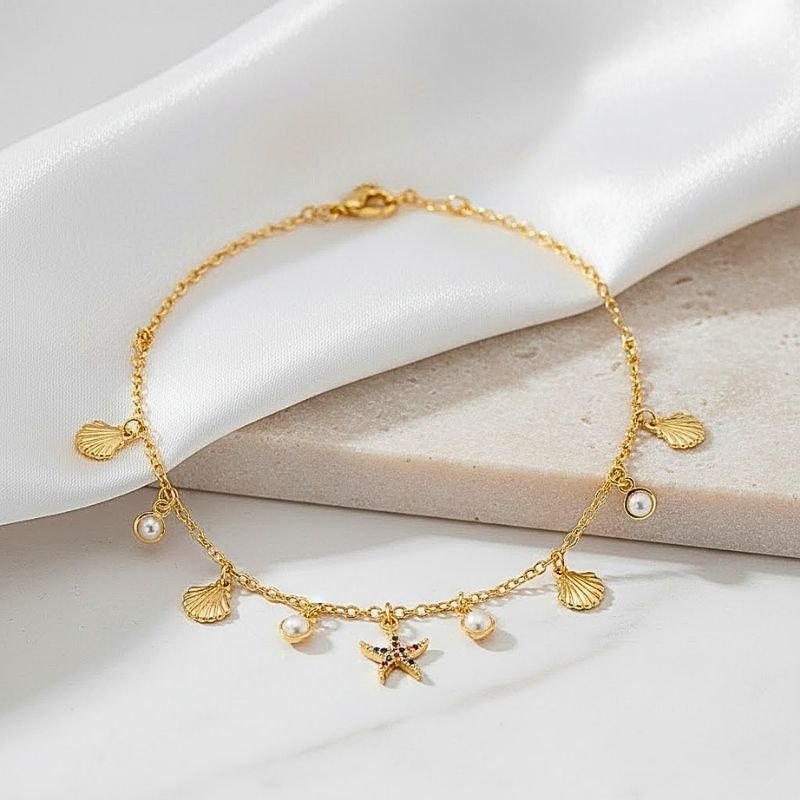 Essa tornozeleira banhada a ouro 18k traz a leveza e o frescor do verão com pingentes delicados de conchas, uma pérola clássica e uma encantadora estrela do mar com toque de cor tropical 🐚🌊⭐. Uma peça que transmite liberdade, feminilidade e frescor em cada detalhe — perfeita para completar looks de praia ou dar um toque descontraído ao visual urbano.