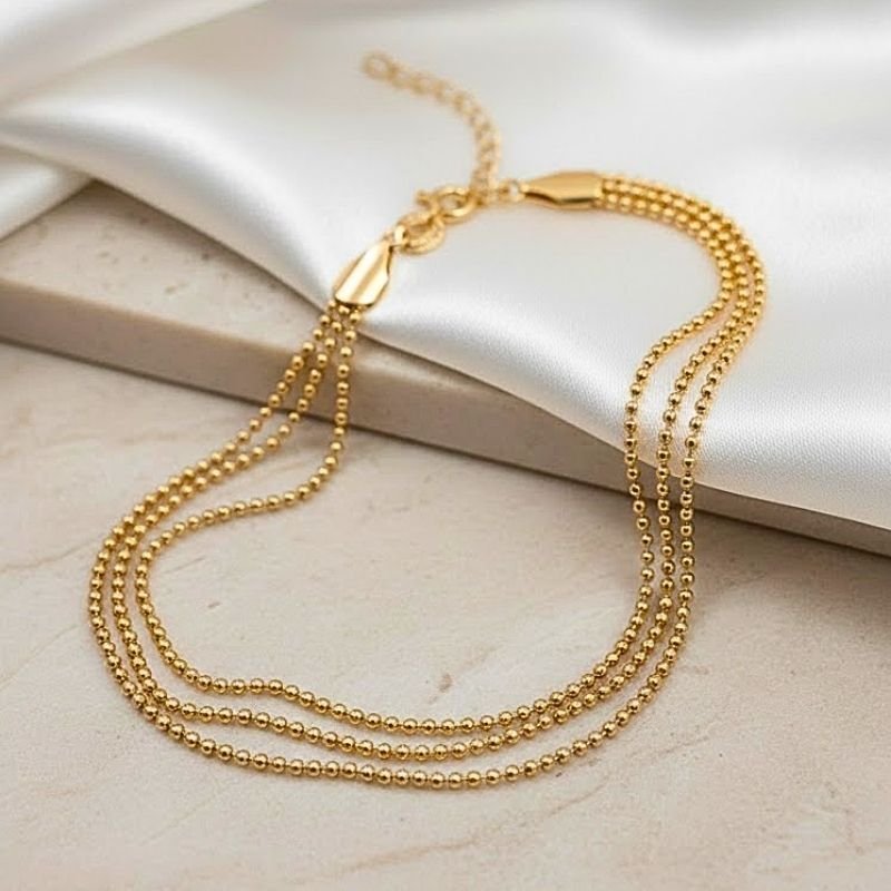 ✨ Tornozeleira Tripla Malha Bolinhas Folheada a Ouro 18K – Movimento, brilho e estilo em camadas