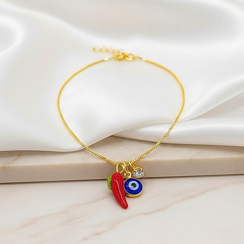 Tornozeleira Pimenta, Olho Grego e Ponto de Luz – Corrente Veneziana Banhada a Ouro 18k ✨